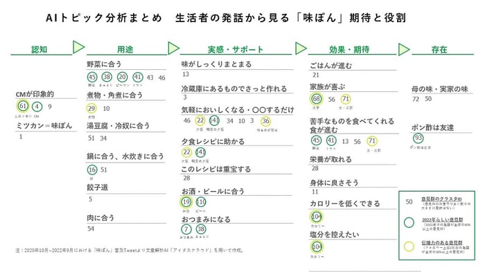 具体的に言うと、まず何千件ものSNSの発話をAI分析にかけたところ、鍋に使える、大根と合うといった、味ぽんならではの発話の塊を確認しながら、どんな発話がレア度が高いのか、ユニークなのかを確認しながら分析を進めました。