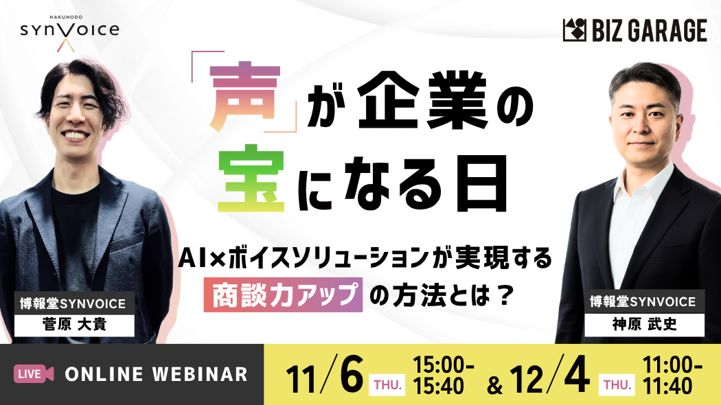 デジタル変革の次なるフロンティアは、これまで見過ごされてきた「音声データ」です。 単なる効率化を超え、顧客の感情や市場の動向といった生きた知見の宝庫である音声は、企業の競争優位性を決定づける戦略的な資産となりつつあります。本セミナーでは、音声データがもたらす革新的な可能性と、それを戦略的に活用するためのステップを、具体的な手順やサービスを交えてお伝えします。 お申込みはこちら 目次 こんな課題・問題を抱えている方におすすめ 商談内容が記憶頼りで誰と何を話したか明確ではない 商談メモの作成が行えていない デ商談のノウハウが属人化し全社としての活用ができない このセミナーから得られること 関連のサービス資料・参考資料 サービス紹介博報堂SYNVOICE 製品サイト VOICE VALUE 講演概要 開催日時 ➀2025年11月6日(木)15:00~15:40➁2025年12月4日(木)11:00~11:40※LIVE配信の申込者の方のみ見逃し配信あり 締切 ➀2025年11月3日(月)15:00➁2025年12月1日(月)15:00 参加方法 事前登録制 参加費 無料 プログラム 音声データがもたらす企業優位性 音声データ活用の技術的課題と解決方法 販売現場において注目した2つの課題 voice valueとは voice valueの活用事例 お申込みはこちら 登壇者のご紹介 神原 武史 株式会社博報堂SYNVOICE取締役 事業本部長SIer、起業独立、Saas系スタートアップを経て、2020年博報堂SYNVOICの前身会社に入社し商品企画、事業部長として従事、2025年より現職。 菅原 大貴 株式会社博報堂SYNVOICE事業本部 営業部 プリセールスG2024年に入社。プリセールスとして主に自動車業界を担当。電話や商談など、顧客接点におけるボイスソリューション全般を提案し、販売現場の課題解決に取り組んでいる。 お申込みはこちら